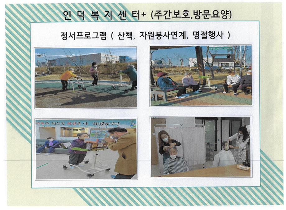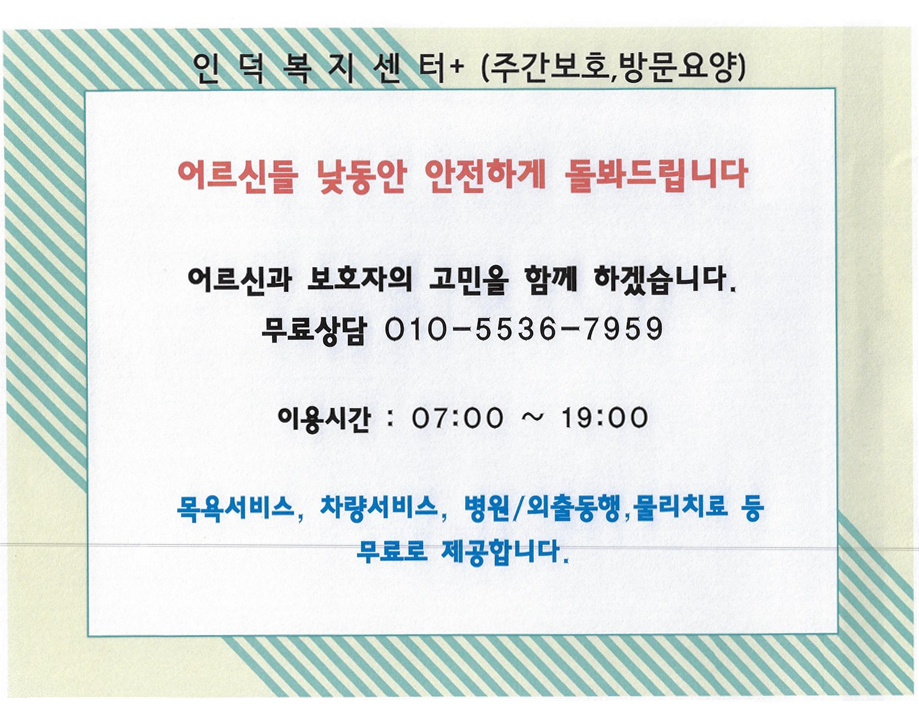 | 기관명 | 인덕복지(주간보호, 방문요양)센터+ | 급여종류 | 주간보호센터 |